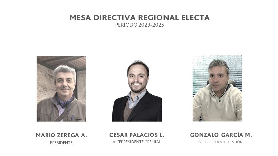 Los socios de CChC Los Ángeles eligieron su nueva Mesa Directiva 2023-2025, con Mario Zerega Arellano como presidente, César Palacios Larenas y Gonzalo García Maldonado como vicepresidentes. La votación alcanzó más del 70% de participación. También fueron electos como consejeros regionales Wladimir Parischewsky Castel, Gerardo Godoy Labrín y José Basauri Córdova.