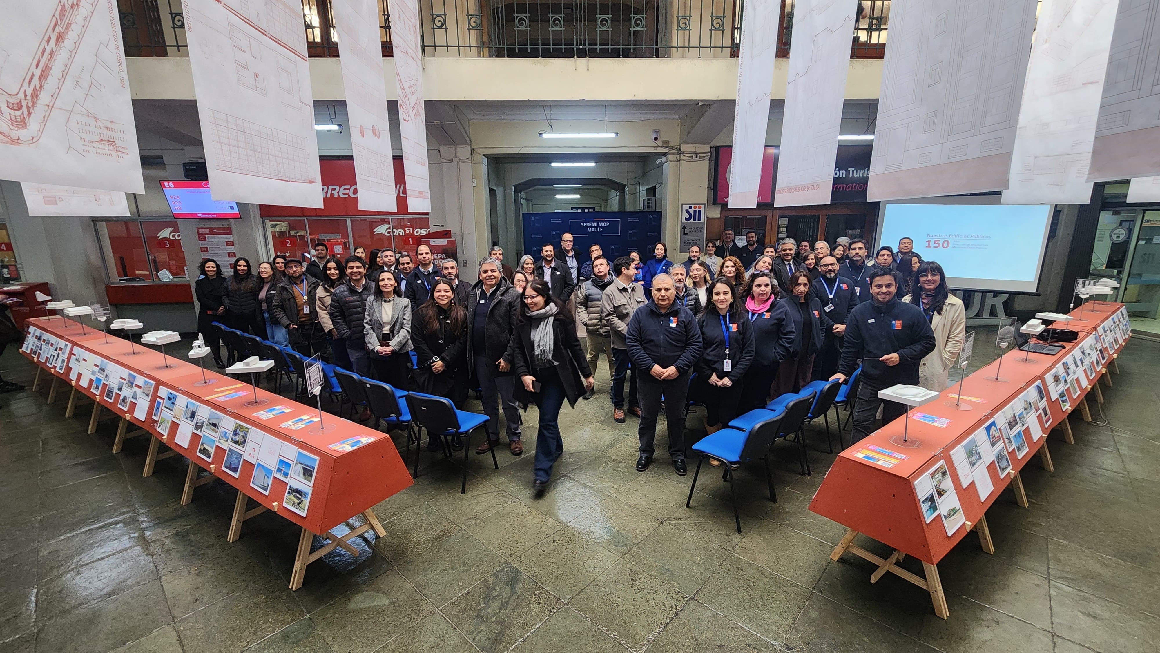 Obras Públicas (MOP), representantes de la Cámara Chilena de la Construcción Maule, encabezados por su past presidenta Adriana Terán, asistieron a la inauguración de la muestra “Nuestros Edificios Públicos”, realizada en el hall del histórico Edificio de los Servicios Públicos de Talca.